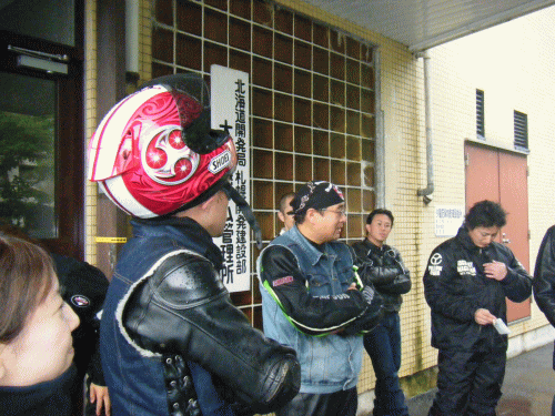 大夕張ダムで止まって管理棟の屋根の下で雨宿り。予報を信じてカッパ持ってきてない人多数。