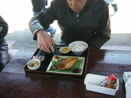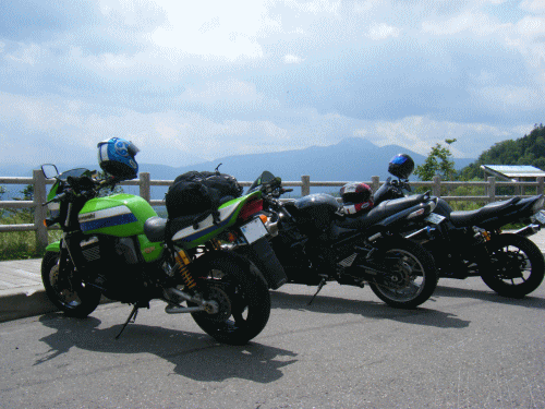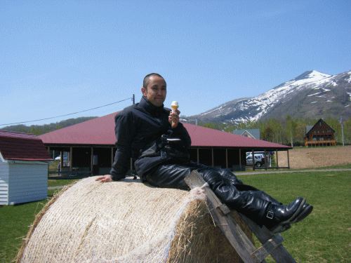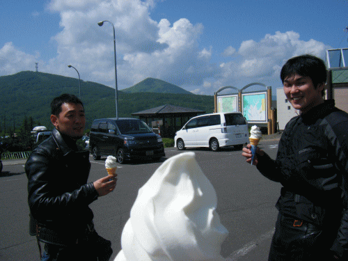 狩勝峠でソフトクリームをほおばるオトコ3人。