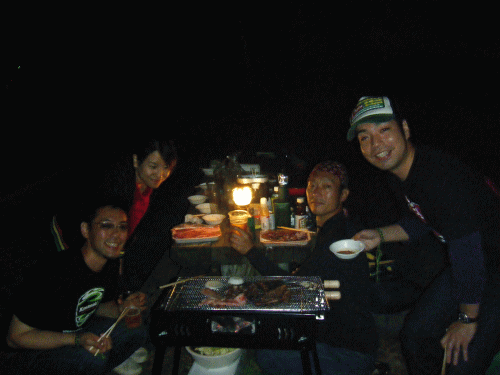 肉焼いてエビむいてビール飲んでと楽しい宴会です♪