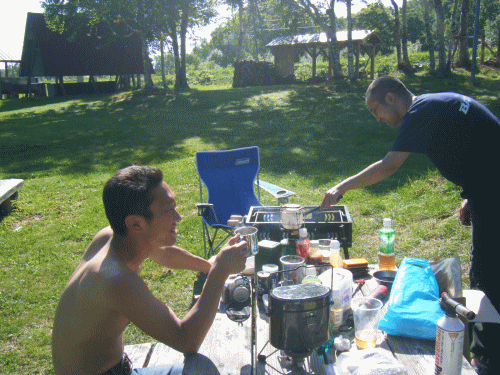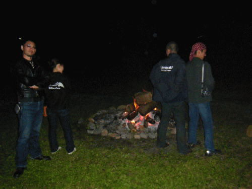 湯加減調整中。火のそばは熱いのでビール持参で。(笑)